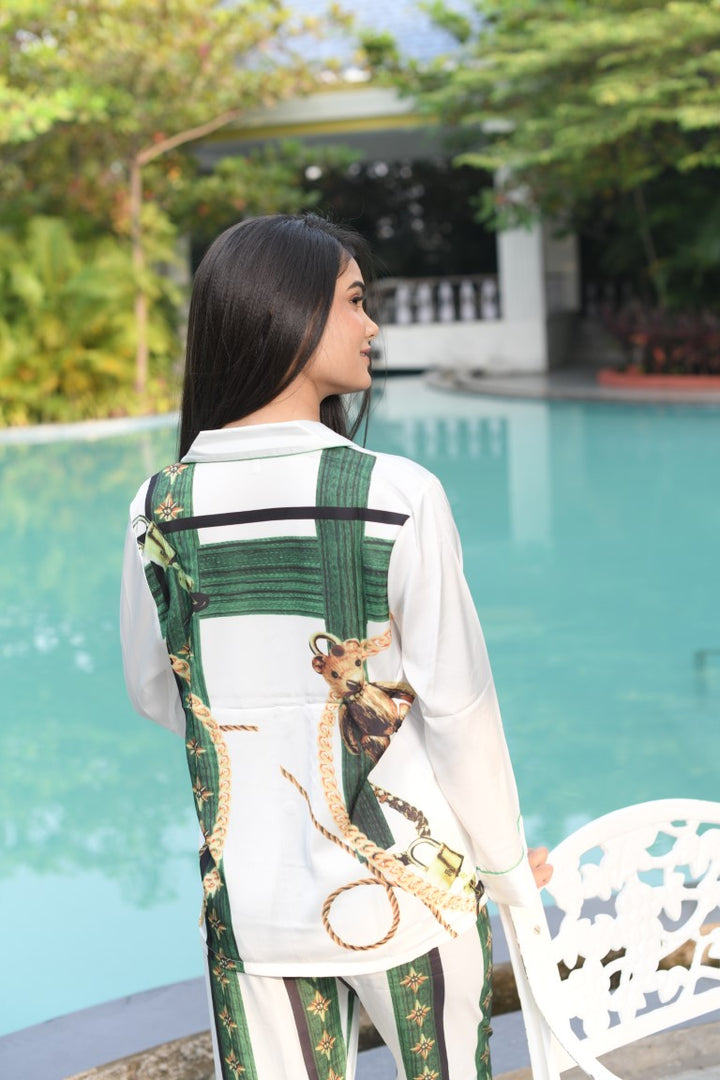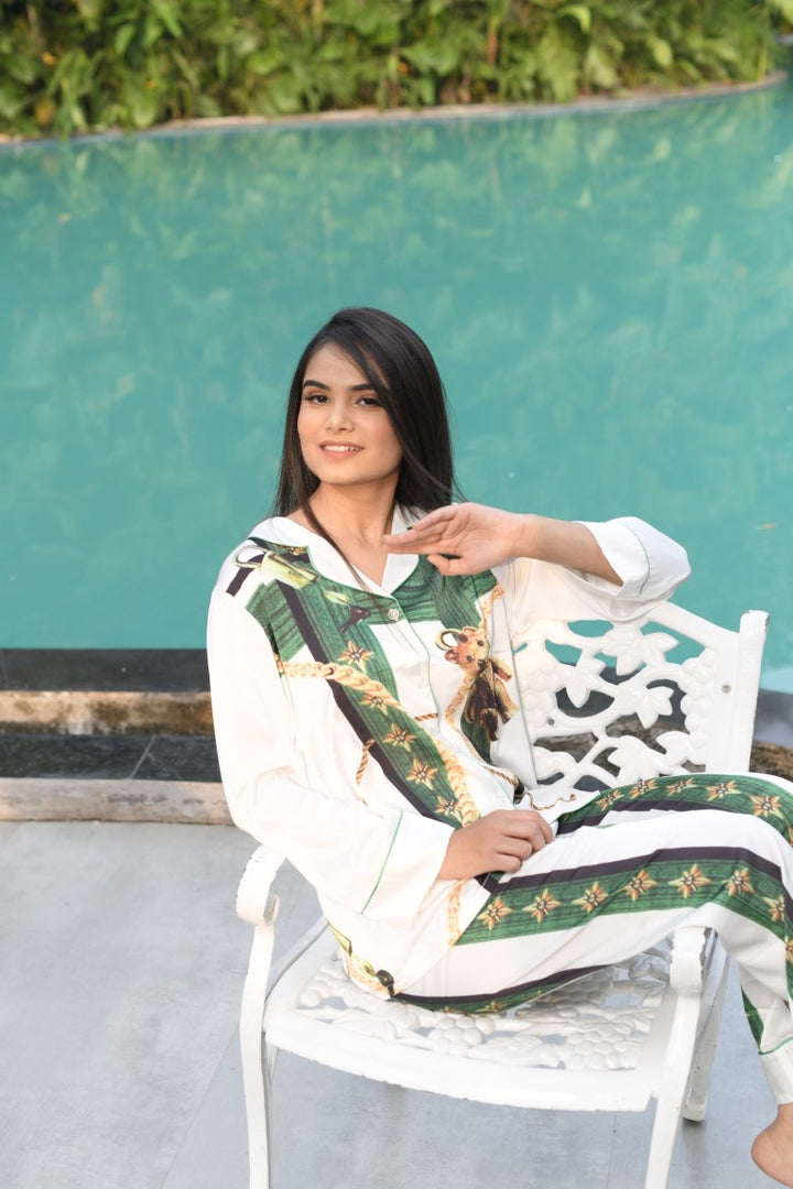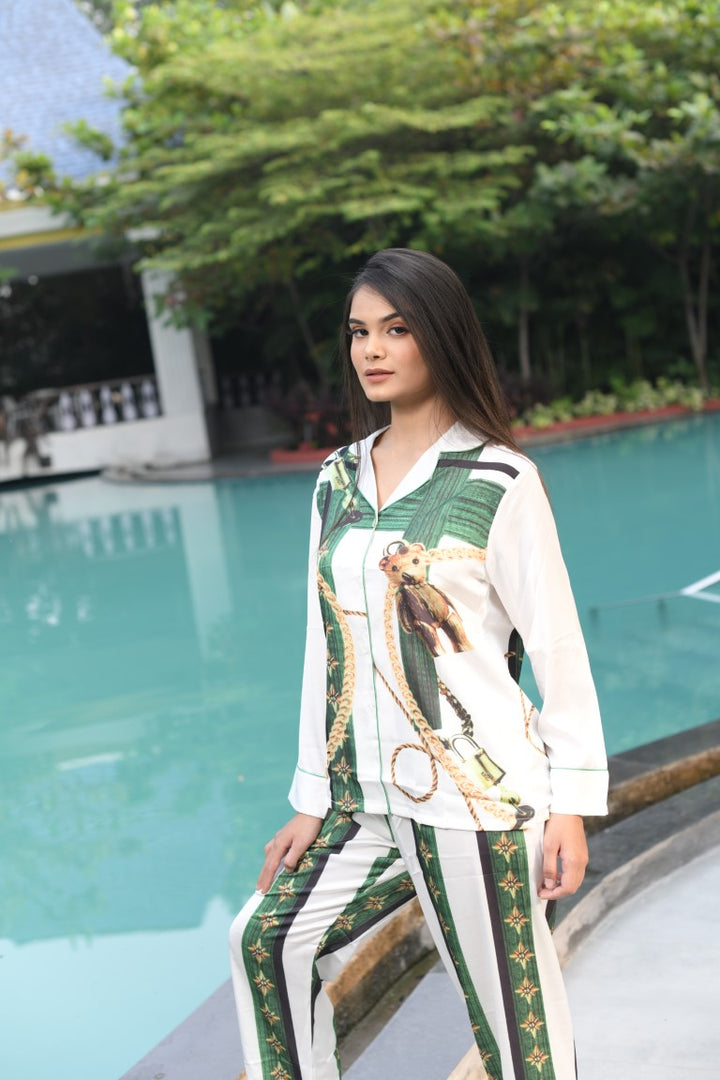 Dark Green & White Brew Bliss Lounge Wear with Bear Motif and Matching Robe Print