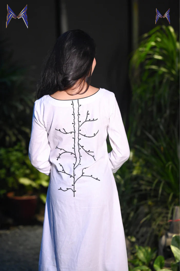 This cotton white tunic is a versatile and stylish piece that can be dressed up or down. Wear it as a dress for a relaxed look or pair it with pants or a skirt for a more formal appearance. Add some silver accessories and a bindi to make a statement at your next gathering.