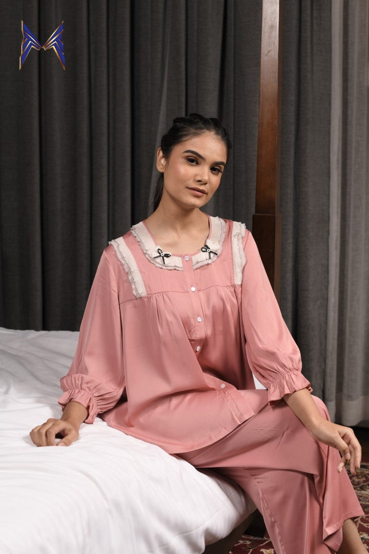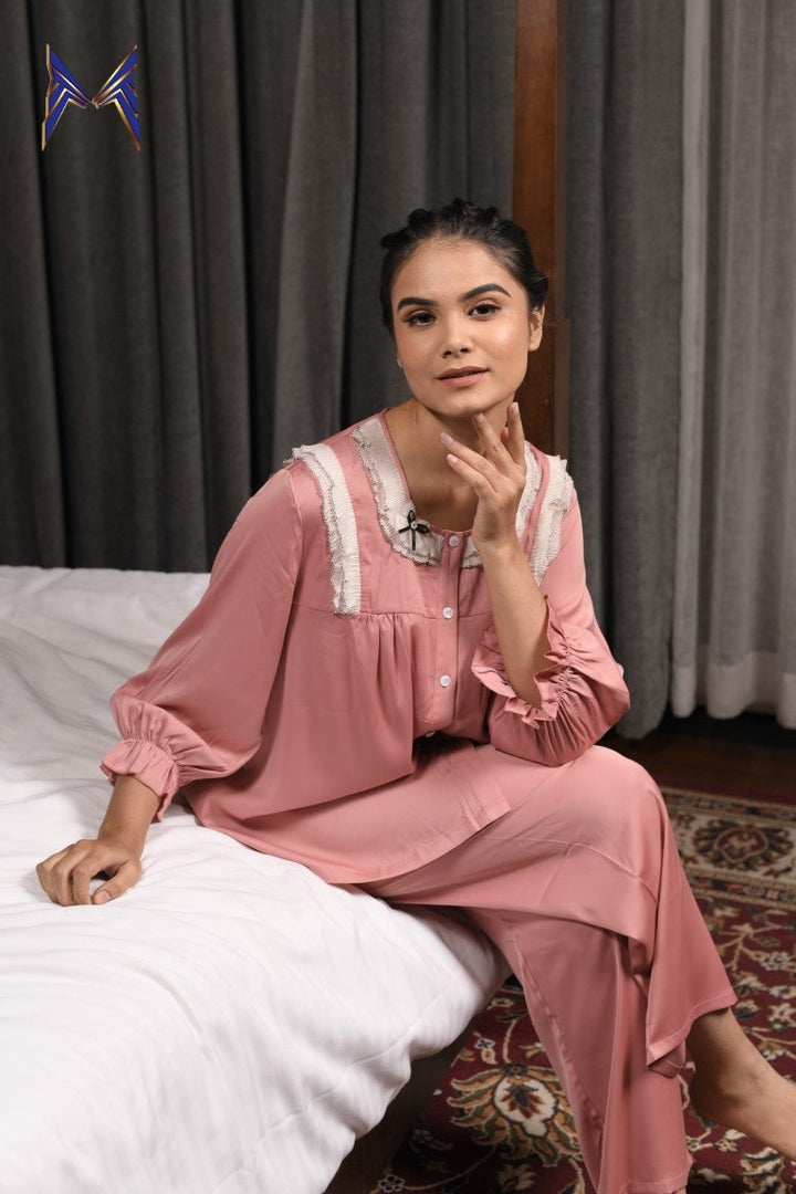 Peach Petals Elegance Lounge Wear in Pinkish Peach with Delicate Lace Neckline