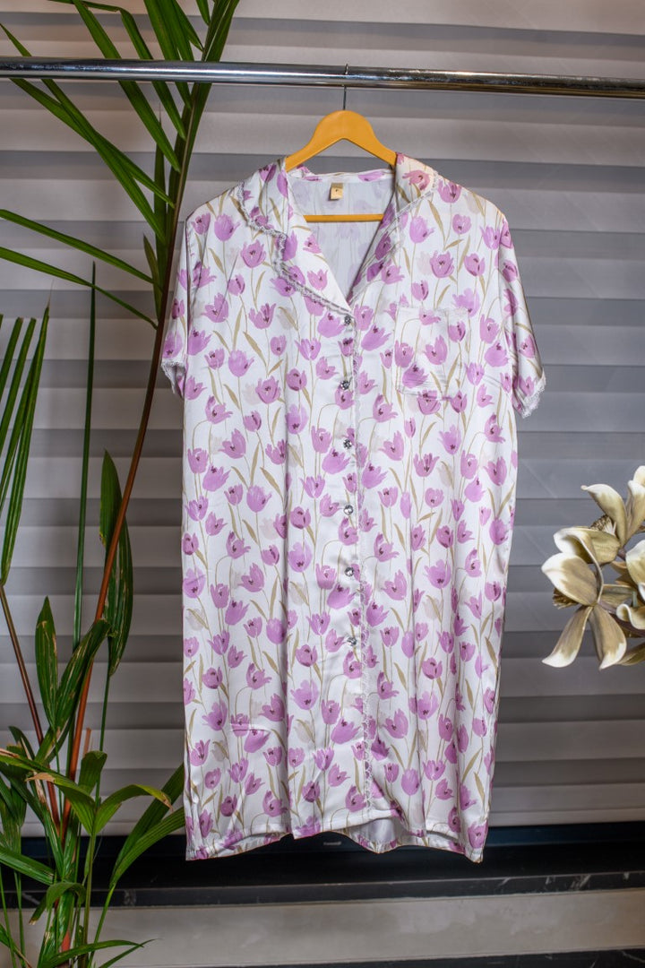Purple Petals Reverie Blossom-Adorned Light Purple Lounge Wear Shirt
